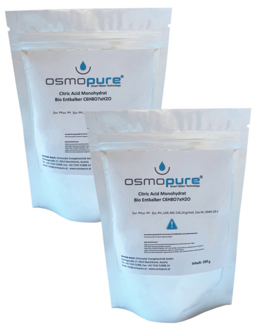 2 x 200g. Citric Acid Monohydrat Bioentkalker C6H8O7xH2O für Auftisch Osmoseanlagen von Osmopure® in Pharmaqualität mit Lebensmittelzulassung, Eur. PH.,USP, MG 210,14 g/mol, Cas-Nr.:5949-29-1, Lieferung im wiederverschließbaren Aluminiumbeutel.